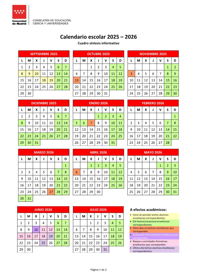 Las actividades escolares se desarrollarán entre el 1 de septiembre de 2025 y el 30 de junio de 2026, con excepción de las correspondientes vacaciones y días festivos.