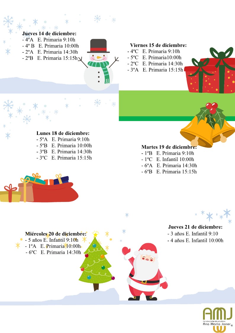 Con la intención de que tengáis suficiente tiempo para organizaros y acudir a los festivales de Navidad de vuestros hijos os adelantamos la fecha y hora de cada uno de ellos.