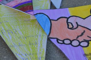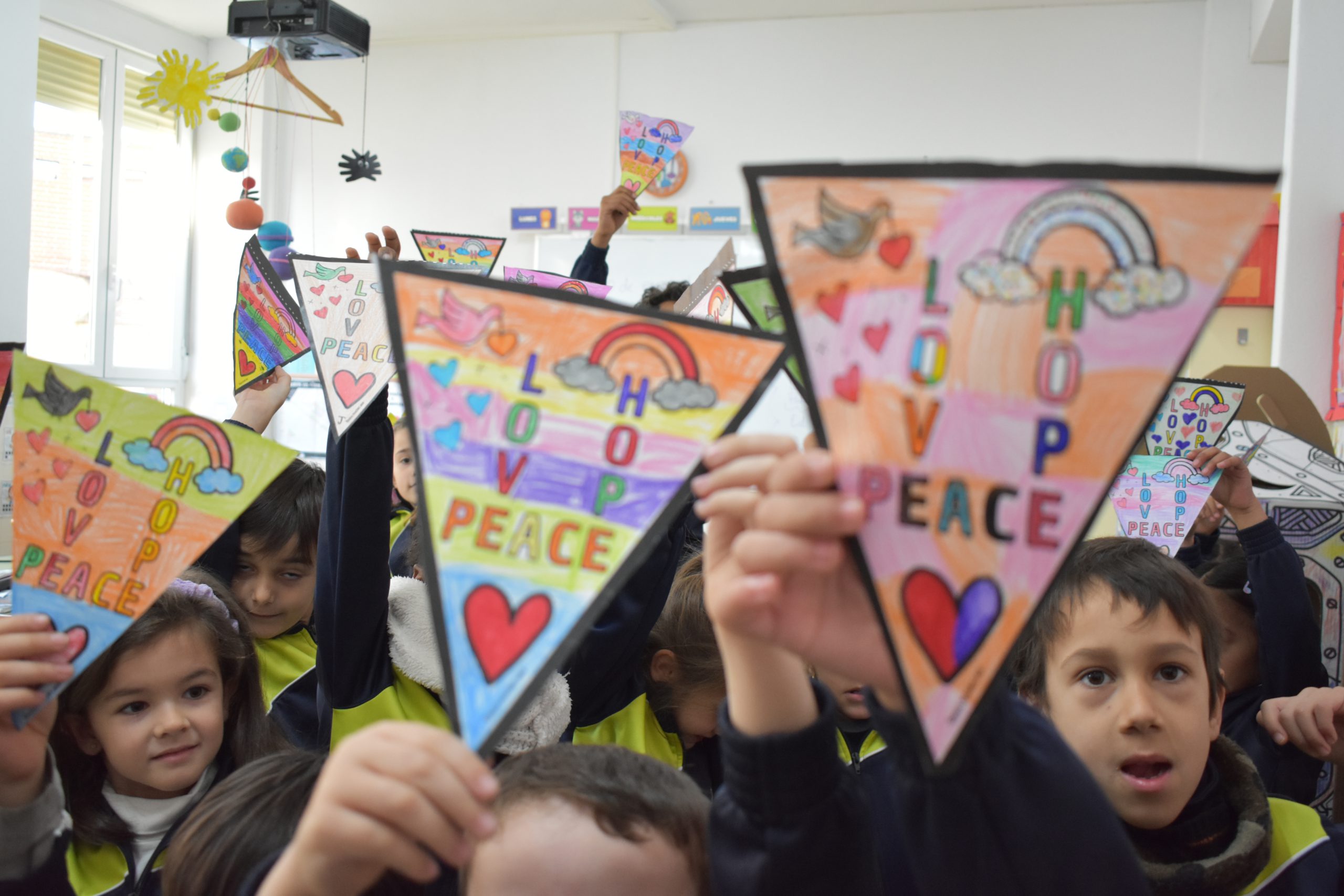 Por otro lado, los alumnos de Primaria colorearon unos banderines de la Paz y salieron al patio para pegarlos en el suelo.