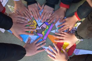 Este año los alumnos y alumnas de Secundaria hicieron una dinámica junto a las y los alumnos ayudantes, que participaron en la preparación de la actividad coordinados por el Equipo de ConvivenciTambién colorearon unos banderines de la Paz con los que formaron la palabra «PAZ» y su símbolo en el suelo del patio y después de eso los alumnos de 2º de la ESO cantaron.