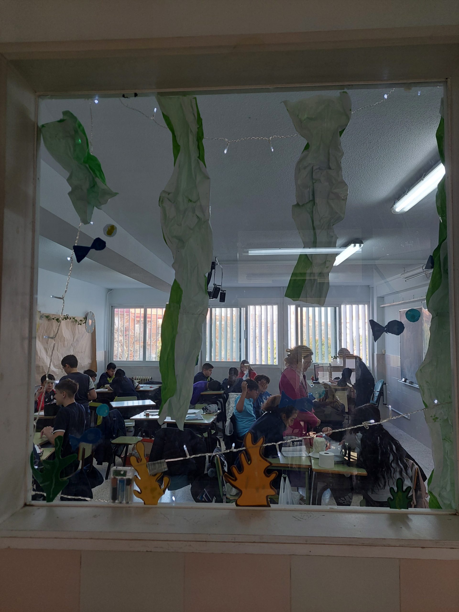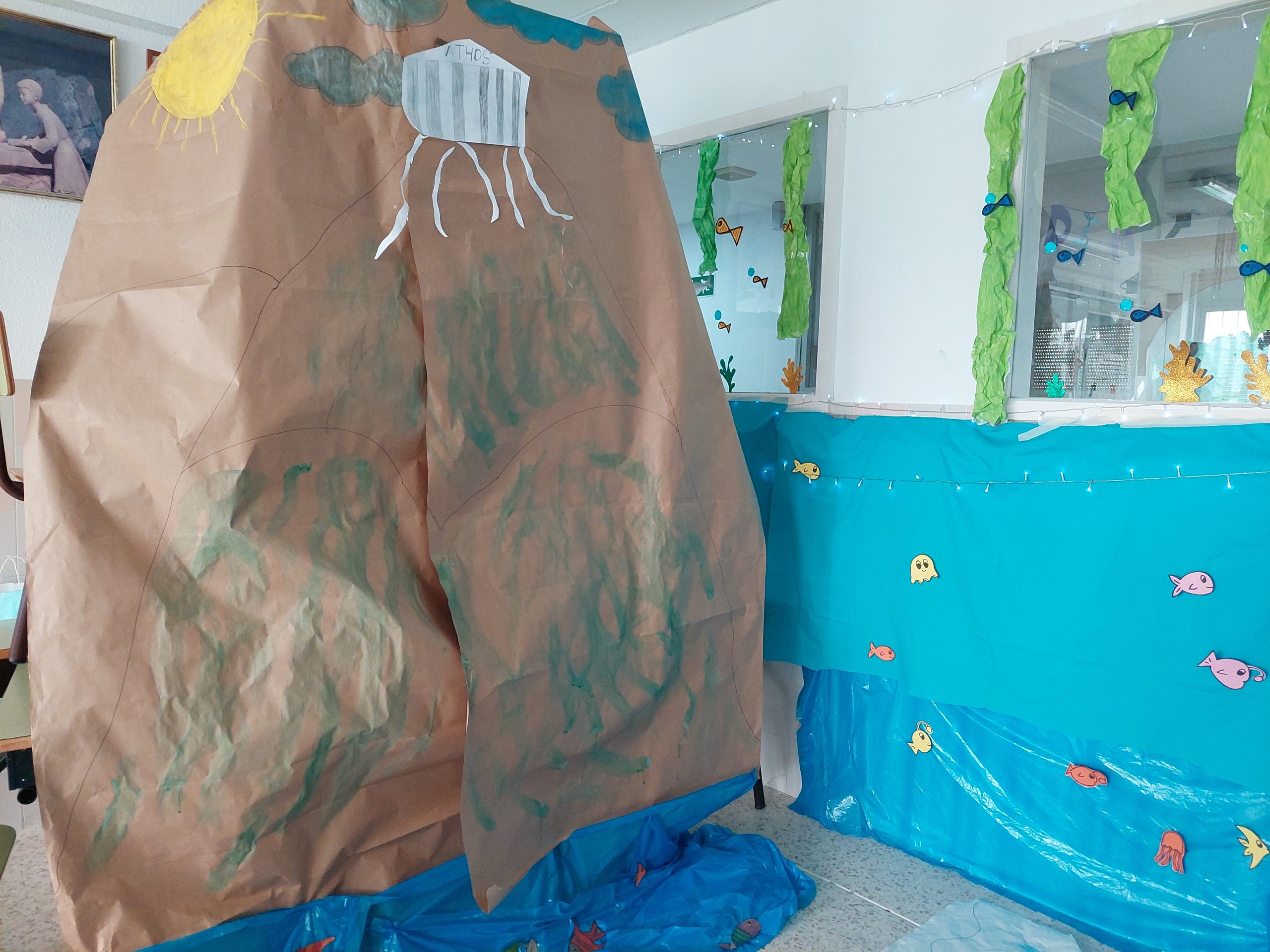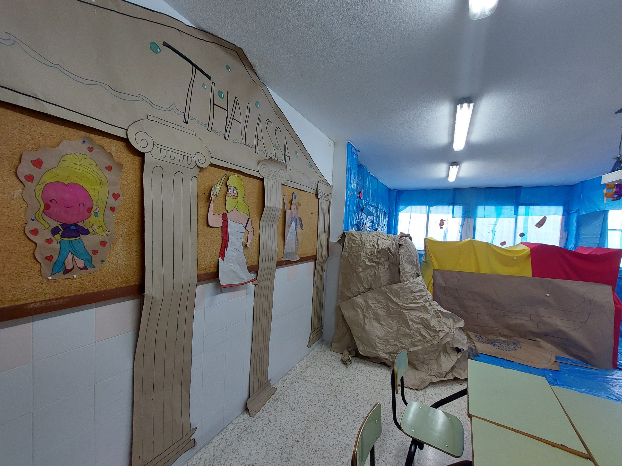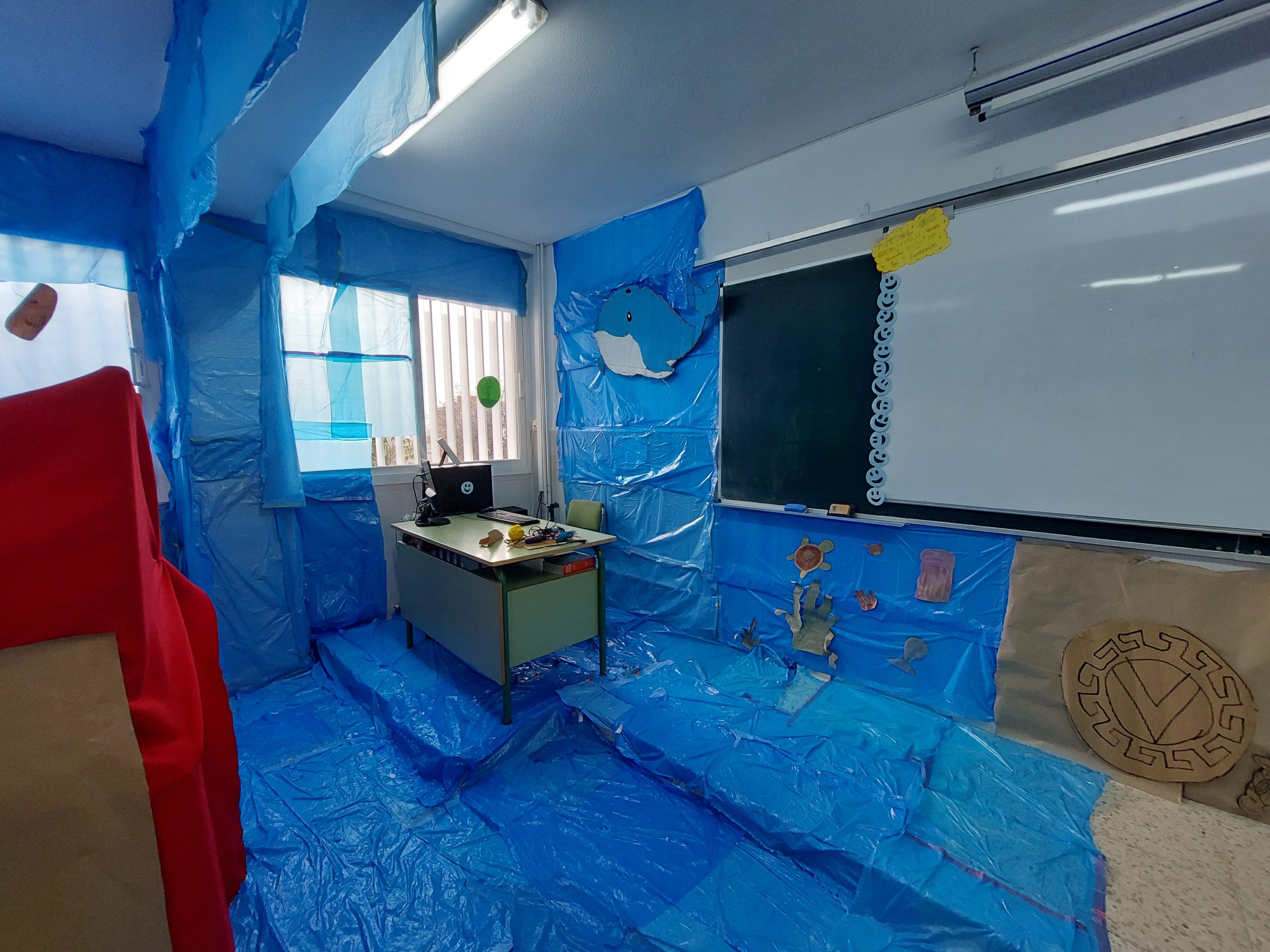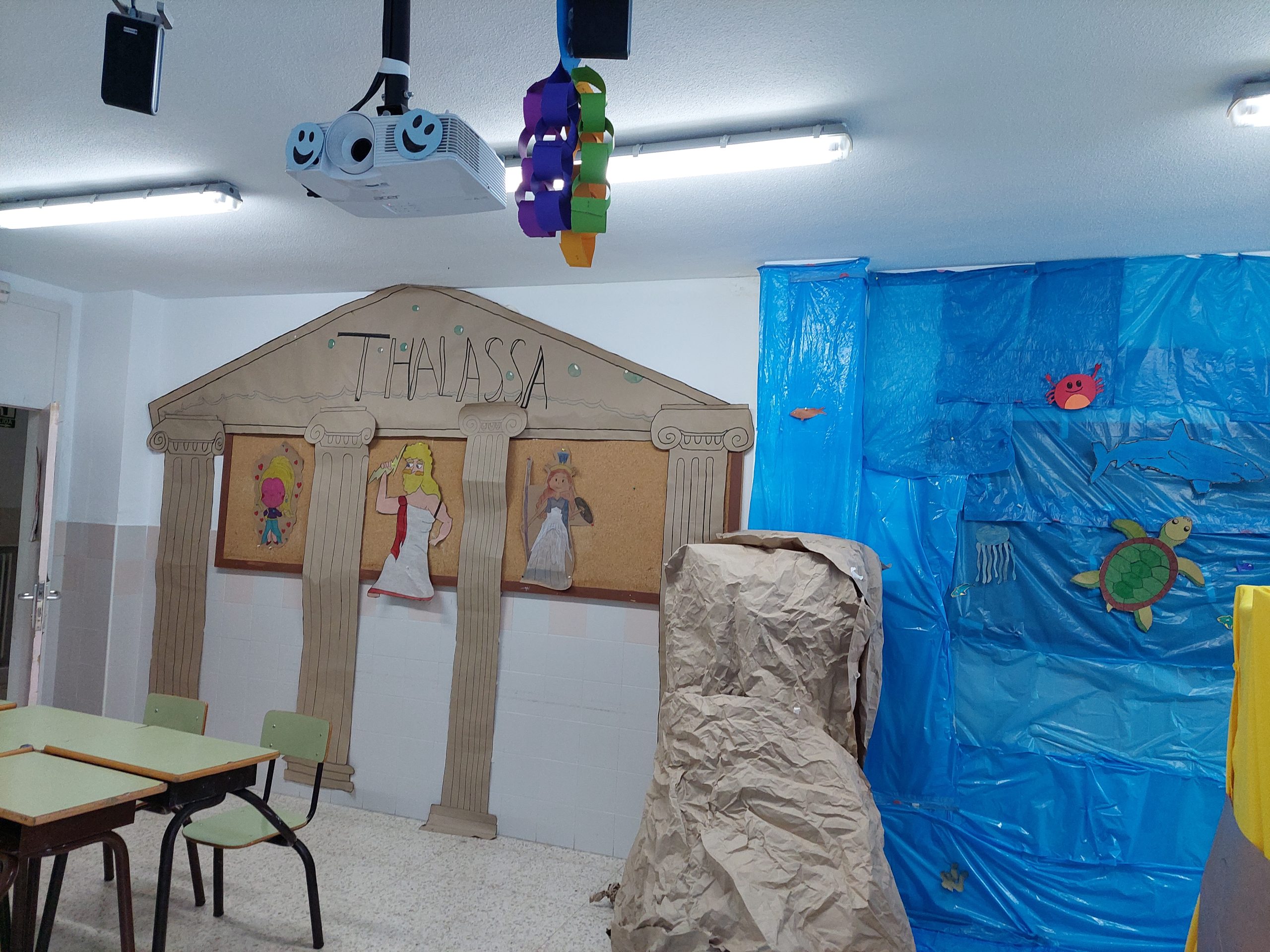 La primera semana nos organizamos con ellos para que cada equipo hiciera un reto de cada asignatura, después probarlos y más tarde decidir cuáles eran los mejores. En la siguiente semana, nos coordinamos para traer el material y hacer de nuestra clase un auténtico templo de Thalassa bañado por el mar Mediterráneo.